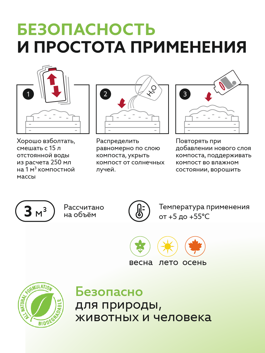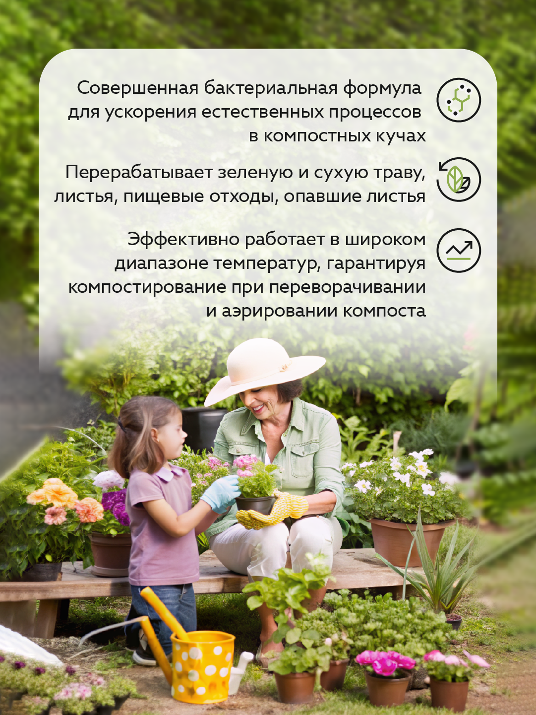 Совершенная бактериальная формула для ускорения естественных процессов разложения в компостной массе. Перерабатывает зеленую и сухую траву, сорняки, листья, овощные остатки и очистки. Эффективно работает в широком диапазоне температур, гарантируя ускоренное компостирование при переворачивании и аэрировании компоста, обеззараживает органические отходы, уничтожает сорняки, прост в применении, безопасен для окружающей среды.