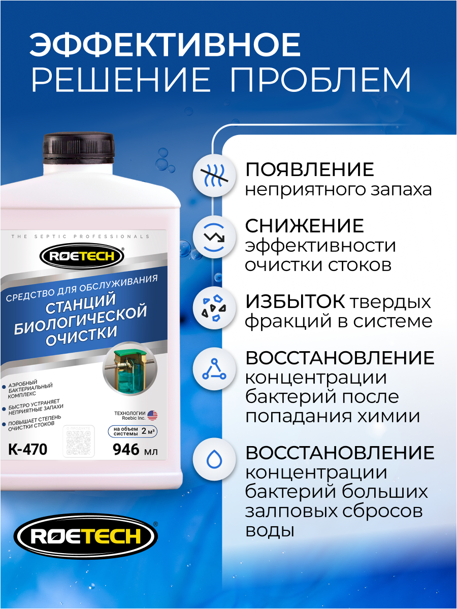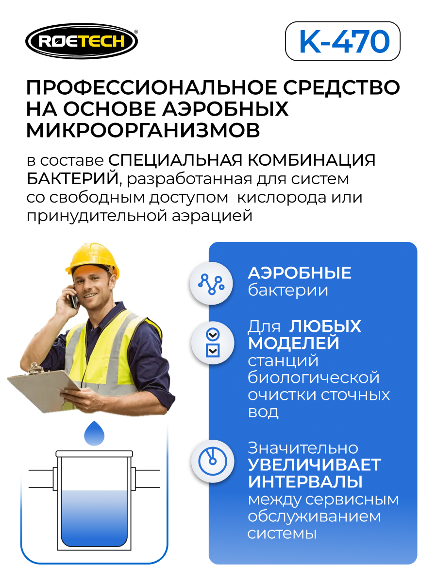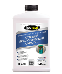 Roetech K-470 — профессиональное средство для современных станций биологической очистки и других систем со свободным доступом кислорода или принудительной аэрацией. Продукт быстро увеличивает концентрацию аэробных микроорганизмов повышая скорость разложения органики.