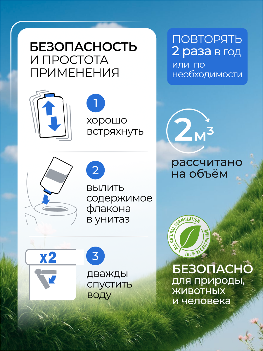 Флакон 946 мл обслуживает резервуар 2 м³. Срок хранения 3 года.